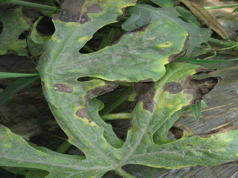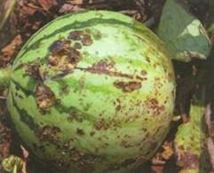 西瓜炭疽病是由半知菌亞門刺盤孢屬真菌侵染所致,其發(fā)病較適溫度為22-27℃,10℃以下、30℃以上病斑停止生長(zhǎng)。病菌在殘棵或土里越冬,第二年溫度濕度適宜,越冬病菌產(chǎn)生孢子,開始初次侵染。附著在種子上的病菌可以直接侵入子葉,引起幼苗發(fā)病。病菌在適宜條件下,再產(chǎn)生孢子盤或分生孢子,進(jìn)行再次侵染,炭疽病的發(fā)生和濕度關(guān)系較大,在適溫下,相對(duì)濕度越高,發(fā)病越重。
